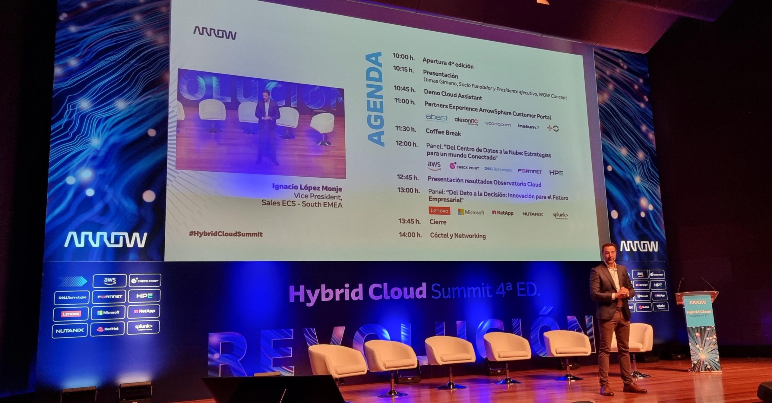 Más de 300 profesionales arroparon a Arrow en la celebración de la cuarta edición de su Hybrid Cloud Summit. Una edición que, como señalaba en la inauguración Iñaki López, vicepresidente del negocio de Arrow enterprise computing solutions para el sur de Europa, iba a tener un protagonista destacado: la plataforma ArrowSphere Cloud, que anunciaba Cloud Assistant, un asistente de IA que se ha integrado en el Customer Portal, lo que abre el uso de esta tecnología a los clientes, siempre a través del partner. Además, se dio voz a un grupo de partners que tuvieron la oportunidad de contar su experiencia con la plataforma.