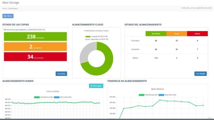 Al mismo tiempo, para que su canal pueda tener el control del backup de los clientes ha puesto a su disposición una plataforma de gestión centralizada. “Nuestros partners pueden controlar todo tipo de clientes y configuraciones desde la Backup Management Platform. Desde el mismo dashboard pueden saber cómo están las copias de clientes de Mast Backup Online, de clientes que hacen únicamente copia local en un NAS o de clientes que están haciendo copias a otros entornos como Onedrive, por ejemplo”, resalta la directora comercial de Mast Storage.