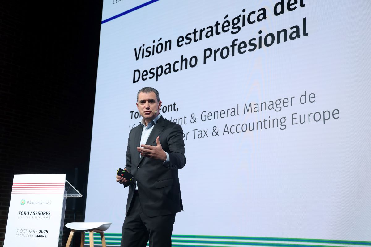 Uno de los momentos centrales de la jornada fue la intervención de Tomàs Font, vice president & general manager de Wolters Kluwer Tax & AccountingEurope South Region, quien explicó el momento de transformación que está experimentando el negocio del asesor por las fuerzas tractoras que se están dando en todas las geografías: la tecnología, los cambios legislativos y la aparición de la inteligencia artificial.